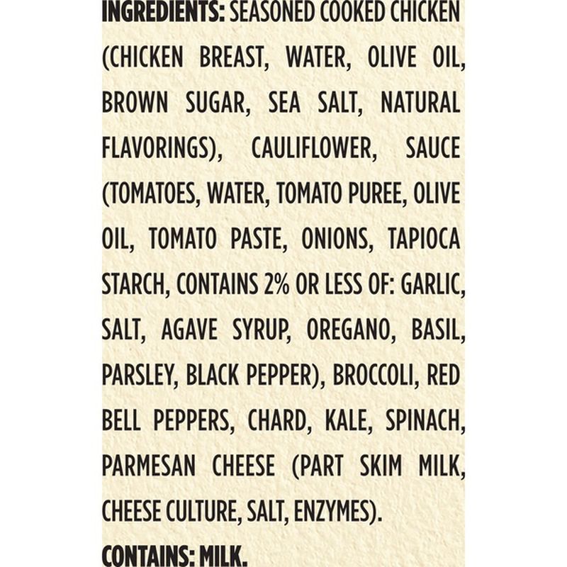 Ingredients seasoned cooked chicken (chicken breast, water, olive oil, brown sugar, sea salt, natural flavorings), cooked brown rice (water, brown rice), water, cooked pinto beans, cooked.